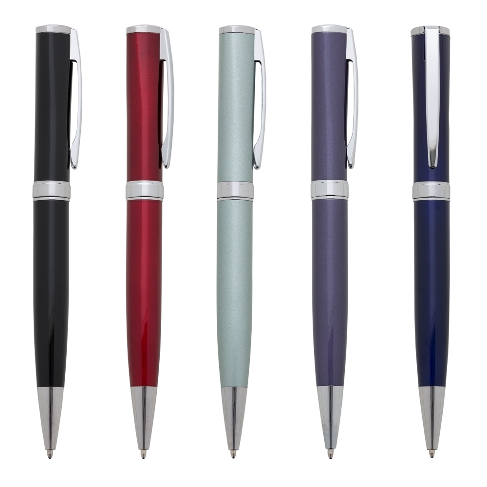 Caneta metálica com carga esferográfica azul 1.0 mm e acionamento por rotação.