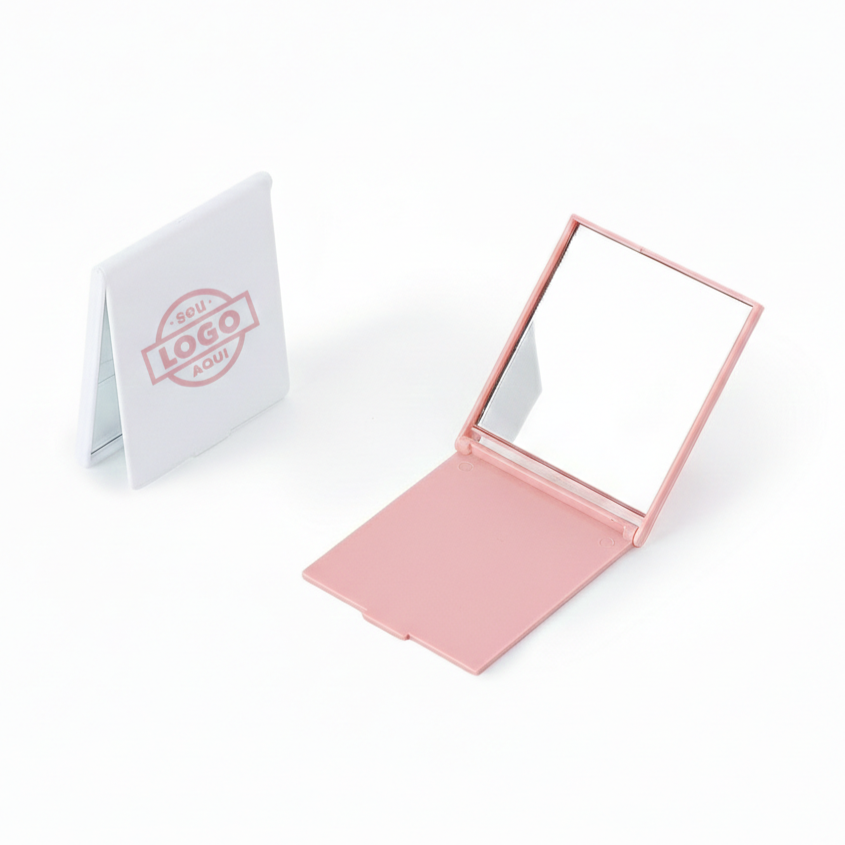 Espelho de vidro sem aumento com moldura retangular em plástico. A tampa protetora, quando inclinada para trás, funciona como apoio para mantê-lo aberto sobre superfícies planas.