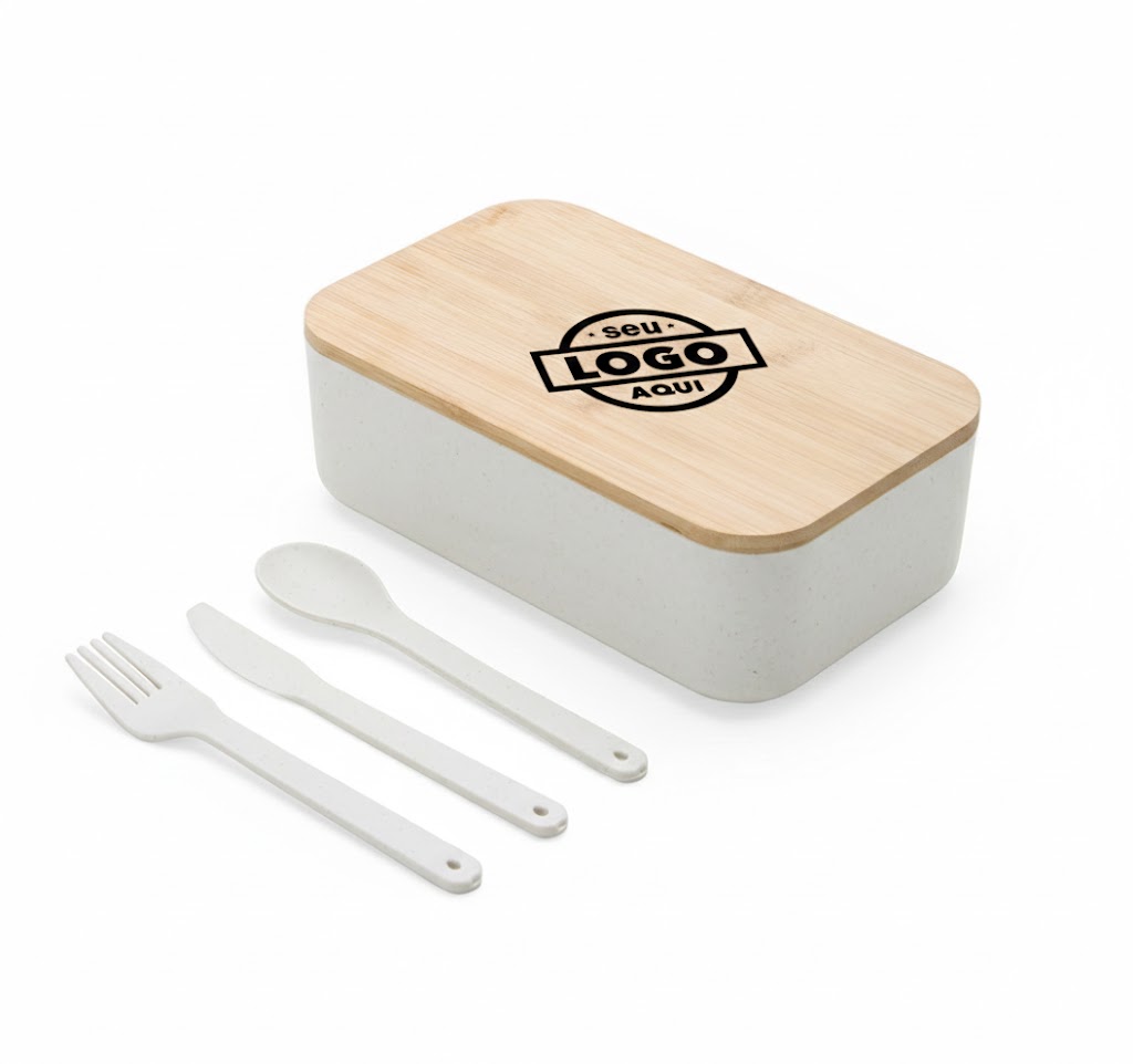 Marmita em fibra de trigo com tampa de bambu de 1 litro. Possui elástico para um transporte seguro. Acompanha garfo, faca e colher. Obs: O tempo de aquecimento no micro-ondas não deve ultrapassar 3 minutos.